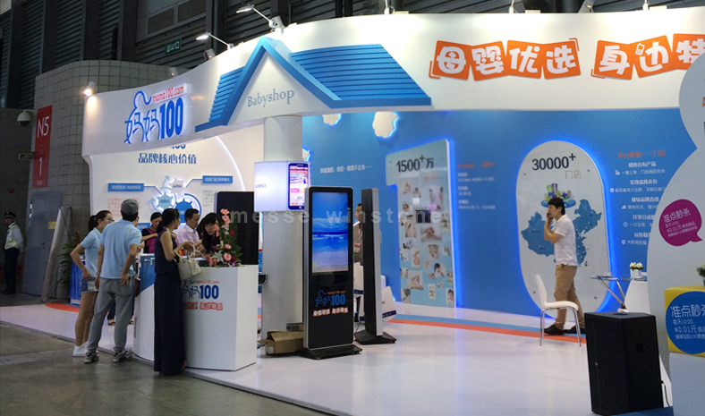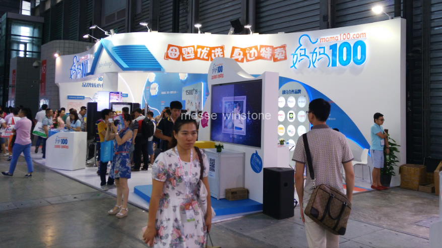 育嬰童展會(huì)現(xiàn)場(chǎng),展臺(tái)整體采用全烤漆材質(zhì),背墻鋼化玻璃襯托,為客戶呈現(xiàn)品質(zhì)建設(shè)。